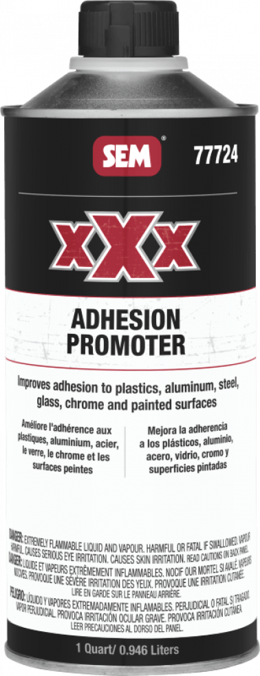 7772( ) XXX ADHESION PROMOTER promotes adhesion of topcoat materials when repairing or refinishing interior and exterior automotive surfaces. 7772( ) may be used on a variety of materials including flexible and rigid problem plastics, aluminum and metal.
