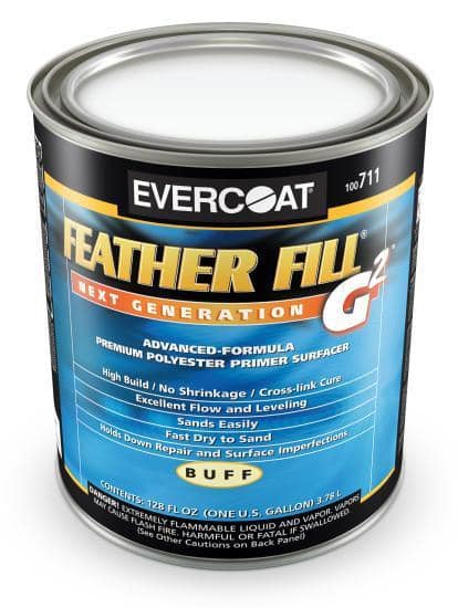 EVERCOAT® Feather Fill® G2™ Premium Polyester Primer Surfacer, 3.78 L Net Content, Liquid Form, Gray, Aromatic Odor/Scent, Composition: Styrene, Talc (Hydrous Magnesium Silicate), Acetone, Titanium Dioxide, Barium Sulfate (BaSO4), Magnesite, Crystalline Silica (Quartz), Mineral Spirits (Stoddard Solvent), 4 to 6 hr Dry Time, Density: 11.35, 132 g/L, 96 g/L VOC, 1200 sq-ft/gal Coverage Area, Application Method: Spray Gun, Applicable Materials: Body Filler or Putty, Epoxy Primer, Fiberglass, Rigid Plastics, Self-Etch Primer, SMC and Wood